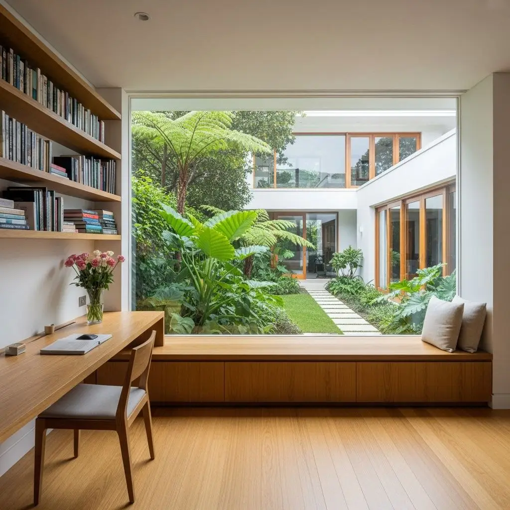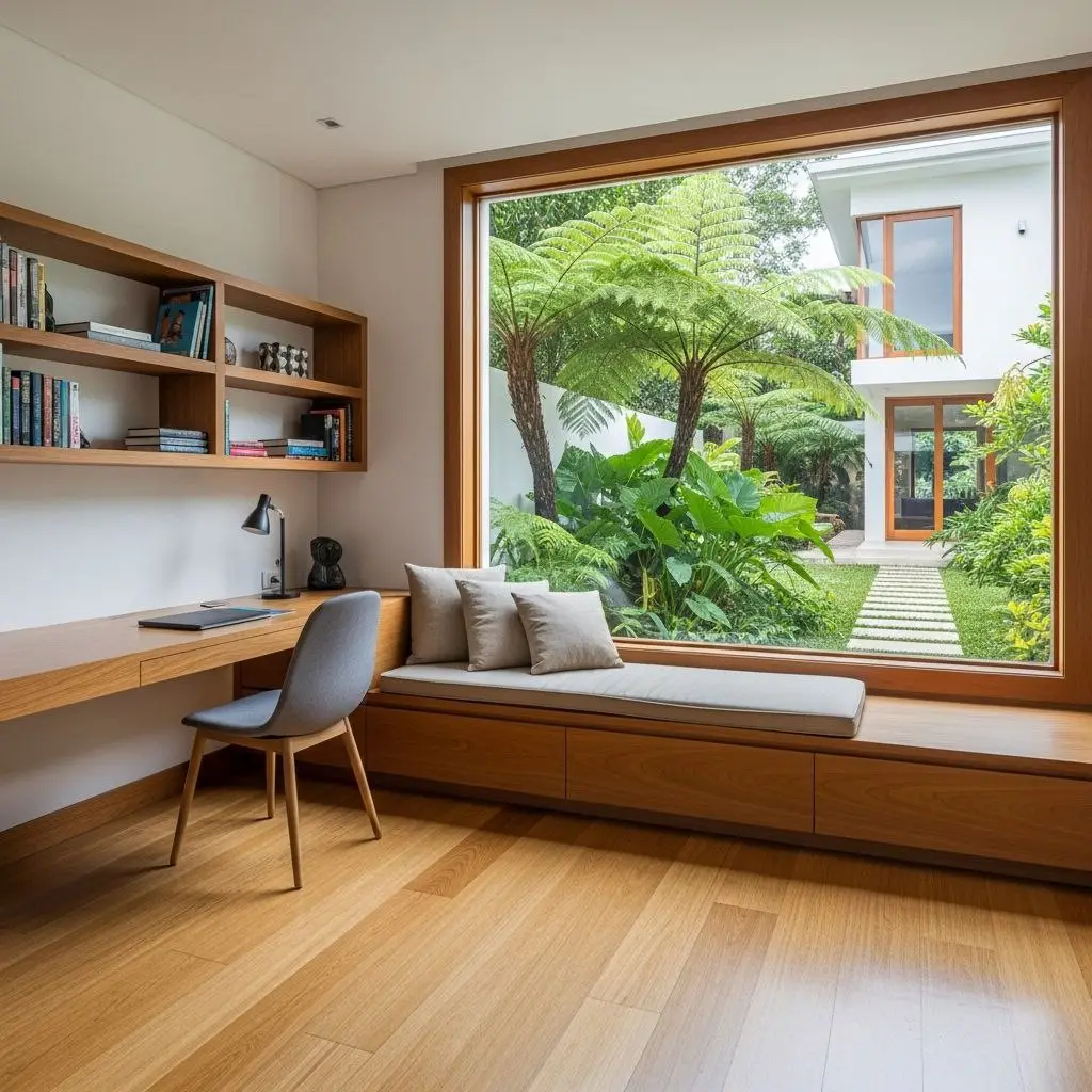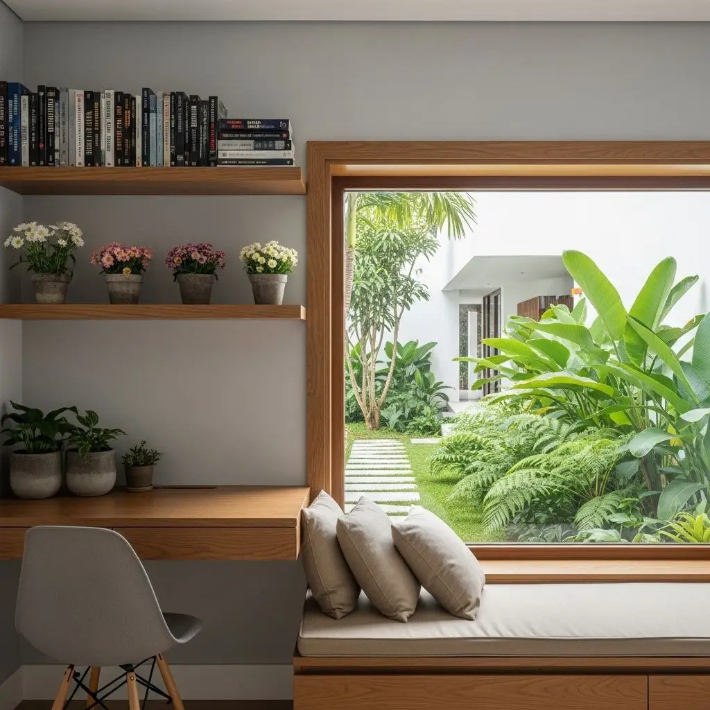 Framed by a large picture window, the seat offers a tranquil view of lush greenery just outside, turning the garden into a living artwork. The built-in wooden bench with soft cushions makes it an ideal spot to curl up with a book, enjoy a cup of tea, or simply sit in quiet reflection.
