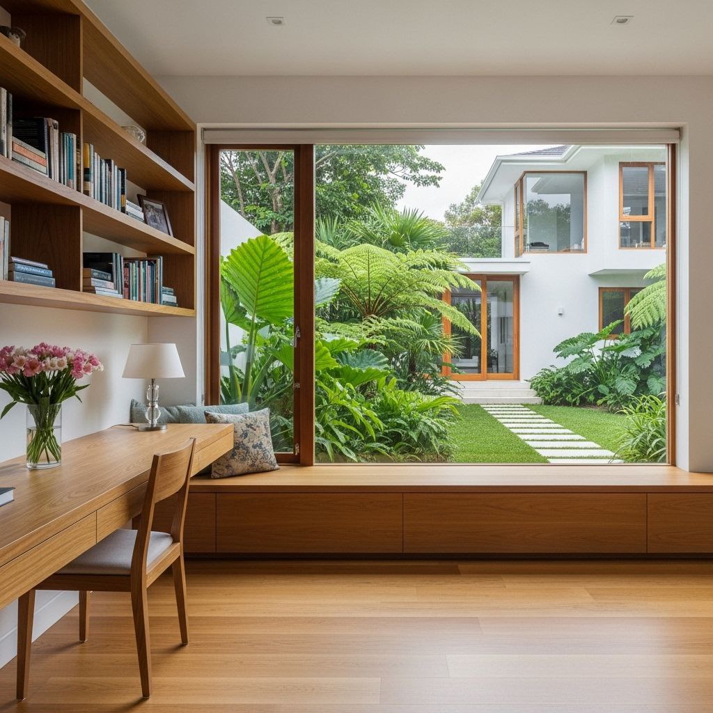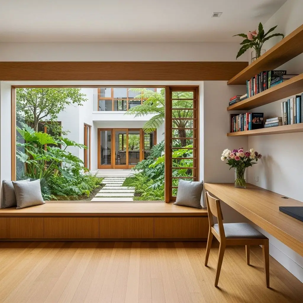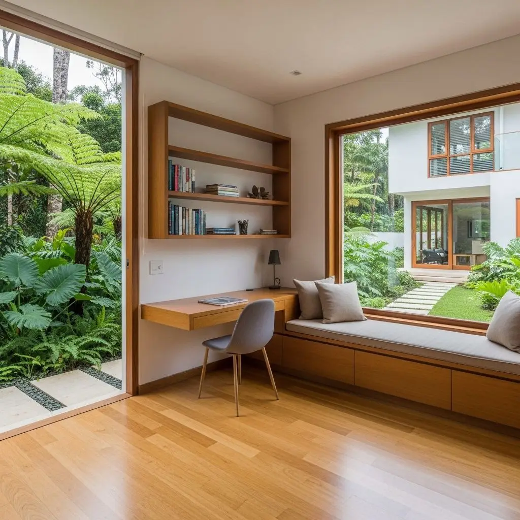 Framed by a large picture window, the seat offers a tranquil view of lush greenery just outside, turning the garden into a living artwork. The built-in wooden bench with soft cushions makes it an ideal spot to curl up with a book, enjoy a cup of tea, or simply sit in quiet reflection.